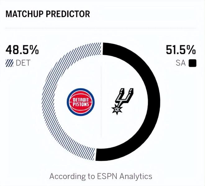 马刺上一场大胜76人,过去13场赛事赢下12场,以44胜17负位列西部第二,本赛季马刺表现惊艳,球队攻防效率均跻身联盟前十,内线文班亚马的防守威慑力毋庸置疑,外线卡斯尔、瓦塞尔等人运动能力出众,全队防守压迫性十足,同时多达8人场均得分上双。结合两队现状,双方均为联盟年轻新生力量,防守表现同样出色。活塞进攻主要依靠坎宁安带动,但他近期状态不算稳定;马刺得分点更为分散,两队上月24号首次交手,马刺曾114-103击败活塞!ESPN预测本场比赛,马刺胜率51.5%,活塞胜率48.5%。