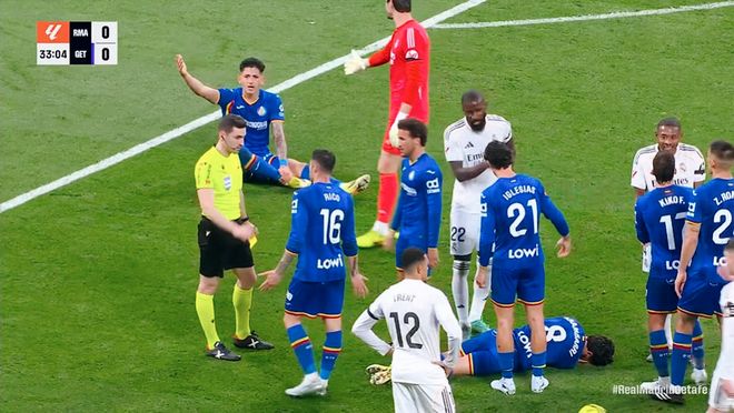 虽然实力并不占优,但是赫塔菲的攻势却丝毫不逊色!从比赛开始,就与强大的皇马,展开了针锋相对的较量,并且数次攻到禁区内制造险情。维尼修斯、居莱尔连续浪费良机。吕迪格膝盖恶意顶里科的头部,导致后者痛苦翻滚!但是裁判竟然没有给出任何的表示。